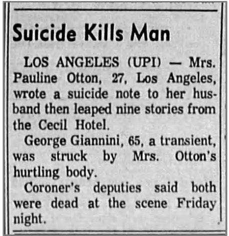 Helen Gurnee, una mujer de 50 años saltó al vacío desde el 7º piso sin motivos aparentes el 22 de octubre de 1.954. Curiosamente se registró una semana antes con el nombre de Margaret Brown.