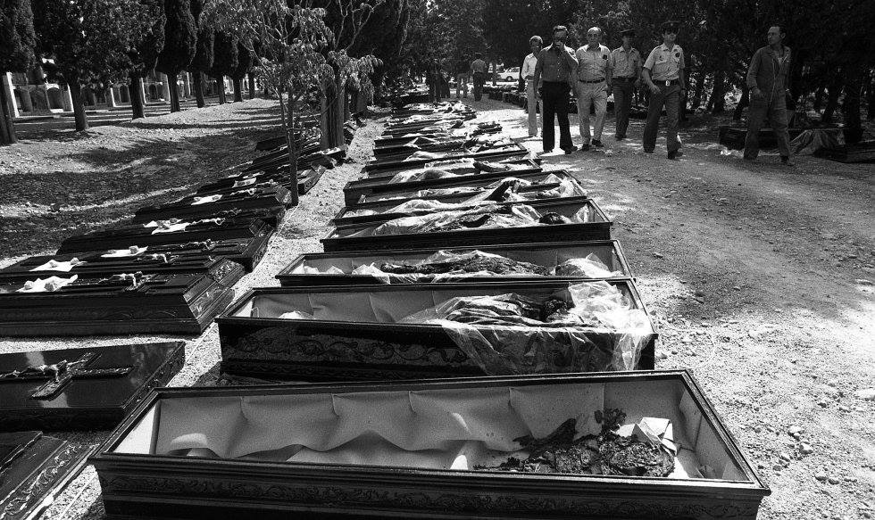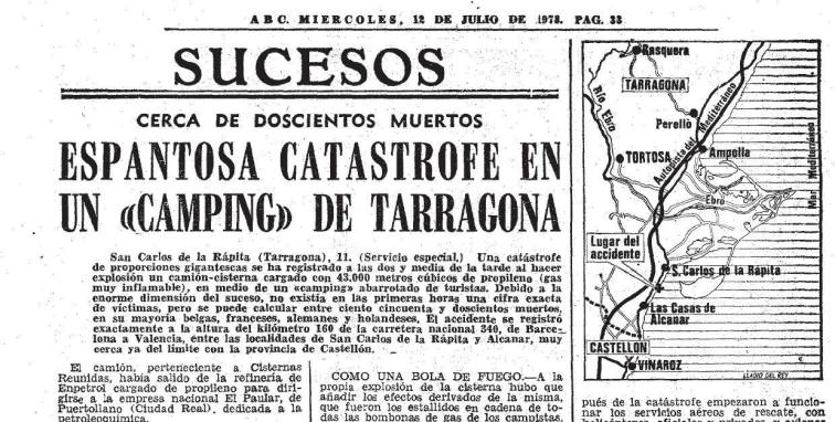 Esto que he relatado se basa en testimonios de varios testigos que afirman haber visto este tipo de apariciones en la N-340 a su paso por el camping de Los Alfaques. La mayoría ya conoceréis el trágico suceso ocurrido en dicho camping en el verano de 1.978 , concretamente el día 11 de Julio. Ese medio día el camping estaba a tope de su aforo con más de 800 personas alojadas, en su mayoría turistas belgas, alemanes e ingleses. Las familias regresaban de la playa a sus caravanas y tiendas para preparar el almuerzo y seguir disfrutand de lo que estaban siendo unas estupendas vacaciones de verano. A las 14,30 , en el kilómetro 159,5 de la N-340 explosionó un camión cisterna cargado con propileno matando a 215 personas y dejando un gran número de heridos. La explosión mató de manera inmediata a 103 personas. En días posteriores los heridos graves, algunos con quemaduras de hasta el 90% de la superficie corporal, fueron engrosando la lista de víctimas mortales. Un año después habían sido identificados todos los cadáveres, excepto dos. La expansión del propileno provocó una lluvia de fuego que además afectó a bombonas de butano y depósitos de combustible de los coches que también explosionaron, llegando a alcanzarse temperaturas de más de 2.000 grados carbonizando en el acto a decenas de personas. Muchos huyeron hacia la orilla de la playa, lo cual fue una decisión fatal, puesto que el agua llegó a hervir. La escena era dantesca, con cuerpos irreconocibles, algunos incluso sentados a la mesa en la posición en las que les sorprendió la explosión.
