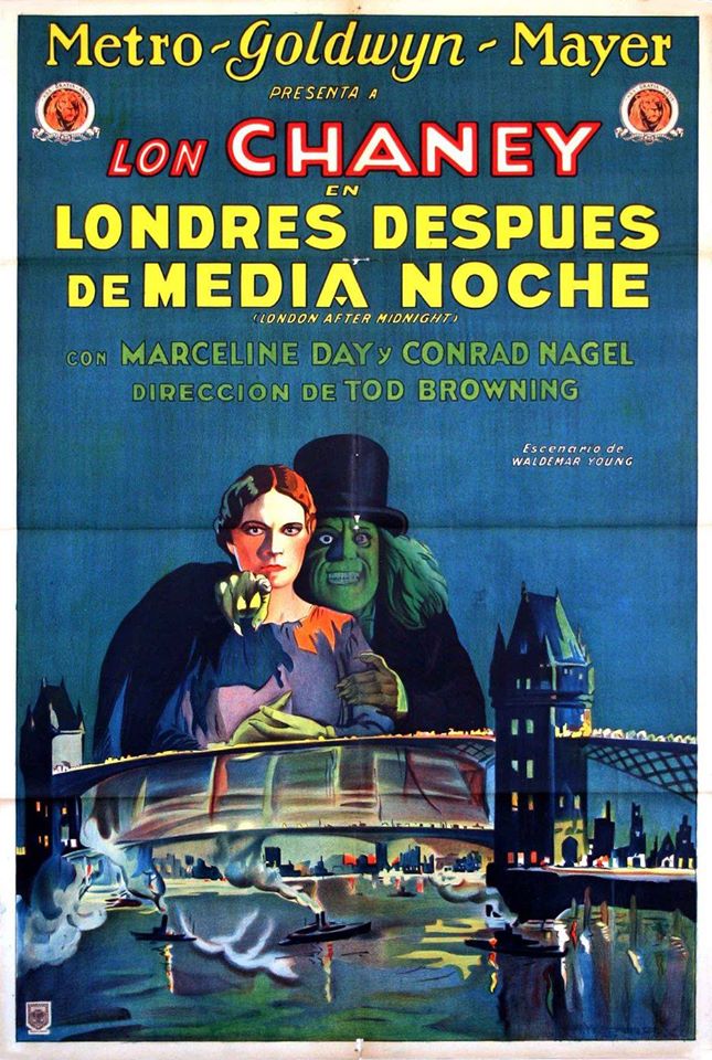 Siguiendo con vampiros y cine mudo, a lo mejor muchos no sabéis que existe (o más bien existía) una película rodada por la Metro Goldwing Mayer en 1.927 llamada «Londres después de medianoche», dirigida por Tod Browning e interpretada por Lon Chaney en el papel principal.