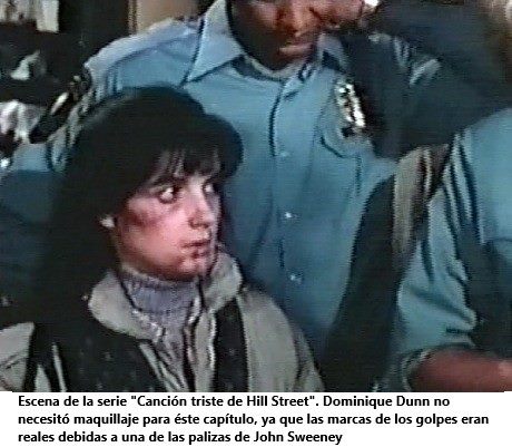 De las discusiones y los gritos pronto pasó a las palizas. En una ocasión Dominique tenía que rodar un capítulo de la serie Canción triste de Hill Street en el que la actriz daba vida a una joven maltratada. Pues bien, los moratones y heridas que se ven en su rostro no eran cosa del maquillaje. Se los había hecho John Sweeney la noche antes del rodaje.