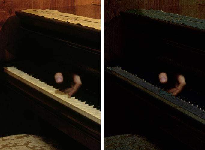 «Al llegar a España comencé a hacer lo que los fotógrafos llamamos la `edición gráfica´, que consiste en ir viendo foto por foto con el cuentahilos, para seleccionar las mejores imágenes. Tengo la costumbre de hacer 4 o 5 diapositivas con una ligera variación de diafragma, pero todas muy parecidas. En este caso tiré 5 diapositivas del rincón del piano. Cuando llegué a esta serie estaba sola en casa. Serían las dos y pico de la mañana. Al poner las diapositivas juntas y verlas a través del cuentahilos me percaté de que, en una de ellas, había una especie de `mancha´ en el teclado del piano. Me fijé bien hasta que advertí que la `mancha´ no era tal, sino que ¡era una mano carnosa!»