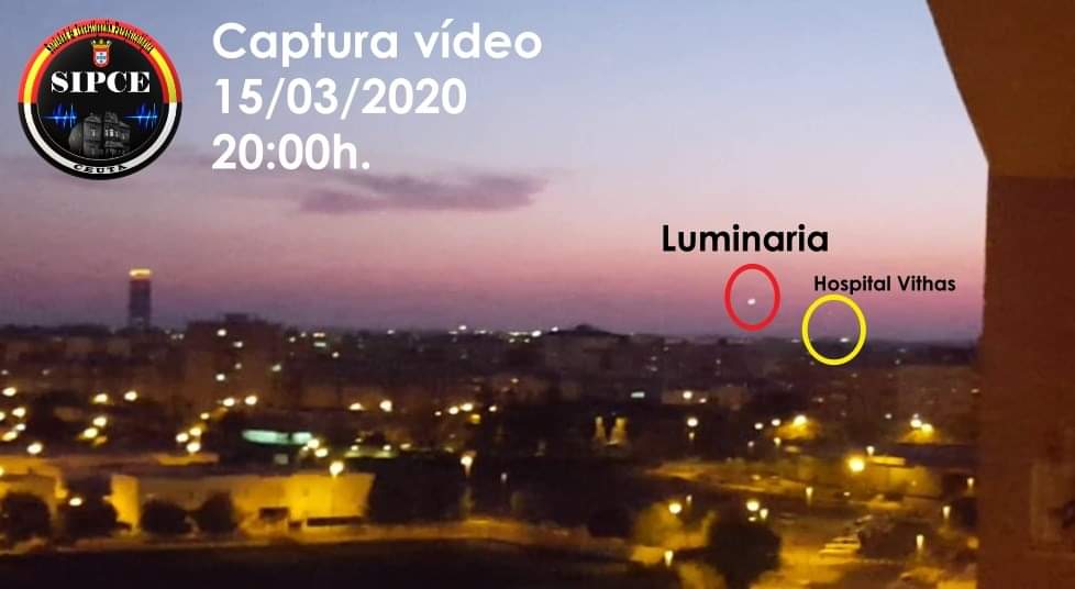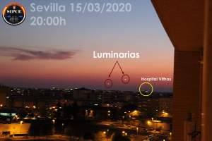 Nos hemos encontrado con esto cuando nos hemos asomado a la ventana a las 20.00. Dos luminarias suspendidas en el aire, sin movimiento y sin parpadeo aparente. A los pocos segundos ha desaparecido la luminaria de la izquierda, y poco después la de la derecha. Nos encontramos al norte de Sevilla y la posición aproximada de las luces era al Oeste. Solo hemos tenido tiempo de coger la Réflex y disparar en automático, sentimos la pésima calidad de las fotos, ya que los objetos salen distorsionados. El vídeo ha sido grabado con un teléfono movil. No solemos tratar éstos temas, pero realmente nos ha parecido muy extraño. ¿Alguien de Sevilla ha visto lo mismo?.